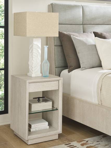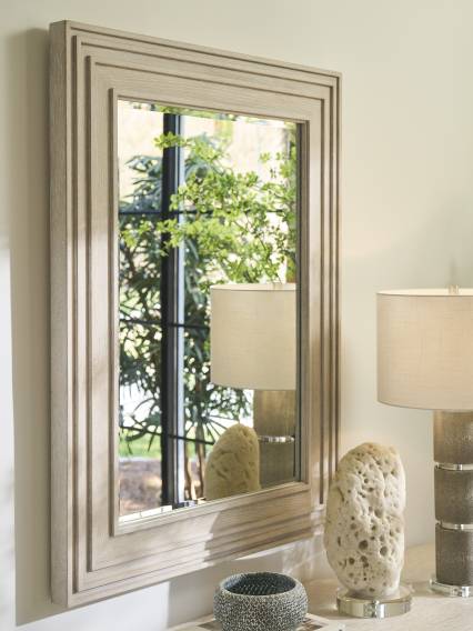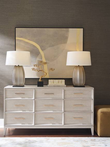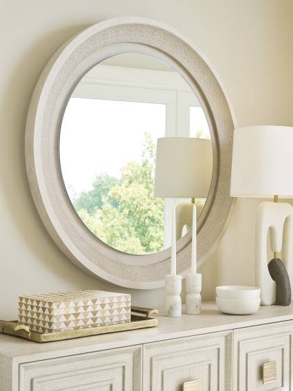 | Product Description: | The 84-inch tall Tamara chest has a great visual presence, with a single piece of wooden hardware in the Sea Mist finish anchoring the center, framed by mitered concentric molding. Behind the doors three adjustable wooden shelves with six removable partitions, five soft-close drawers, and a pass-through grommet for electrical connections. |